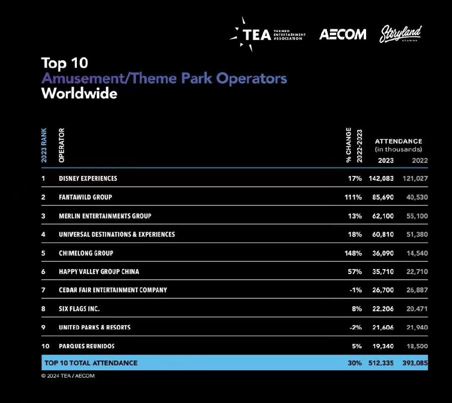 2023年,方特主題樂園全年游客接待總量首次突破8000萬人次大關(guān)。報告強(qiáng)調(diào):“在運(yùn)營商方面,中國的華強(qiáng)方特集團(tuán)已躍升至我們運(yùn)營商排行榜的第二位。”報告特別提到華強(qiáng)方特集團(tuán)的出色表現(xiàn):“2023年有八座新樂園進(jìn)入榜單,它們?nèi)课挥谥袊渲校辛扇A強(qiáng)方特集團(tuán)運(yùn)營。2020至2023年間,方特新開業(yè)10座主題樂園,未來樂園數(shù)量預(yù)計將繼續(xù)增加。”